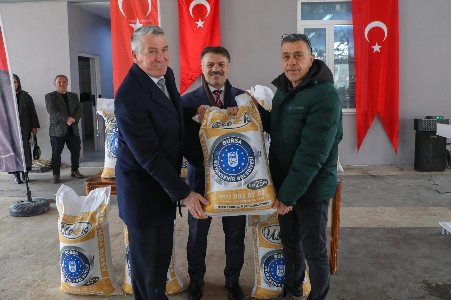 Artan üretim maliyetleri karşısında çiftçiyi destekleyen ve tarımsal sürdürülebilirliğe büyük önem veren Bursa Büyükşehir Belediyesi, Kırsal Hizmetler Dairesi Başkanlığı aracılığıyla kapsamlı bir destek programı yürütüyor. Proje kapsamında Harmancık ilçesinde 102 üreticiye yüzde 50 hibeyle 927 bin 180 lira değerindeki 18 bin kilogram aspir tohumu dağıtıldı. Ayrıca 67 çiftçiye de 1.880 adet ayva, ceviz ve kızılcık fidanı teslim edildi. Bursa Büyükşehir Belediyesi ve Harmancık Belediyesi işbirliğiyle yürütülen çalışma kapsamında ilçe belediyesine ait 128 bin metrekarelik tarım arazisinin elverişli kısımlarında örnek ekim uygulamaları da gerçekleştirilecek. İlçe merkezi ve 31 mahallede yürütülecek çalışmalarla, üreticilere uygulamalı rehberlik hizmeti verilecek. Törende konuşan Harmancık Belediye Başkanı Haşim Ali Arıkan, tarımsal üretimin ilçe ekonomisi açısından büyük önem taşıdığını vurgulayarak desteklerinden ötürü Bursa Büyükşehir Belediye Başkanı Mustafa Bozbey’e teşekkür etti. Öte yandan Büyükorhan ilçesinde de 44 çiftçiye toplam 220 bin lira değerindeki 1215 adet kızılcık ve yaban mersini fidanı dağıtıldı. Tören sonunda üreticiler, verilen desteklerden dolayı Başkan Mustafa Bozbey’e teşekkür ederek, desteklerin artarak devam etmesini temenni etti.