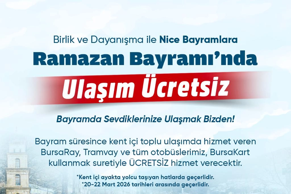 Ramazan ayının manevi iklimini düzenlediği programlarla tüm kentte hissettiren Bursa Büyükşehir Belediyesi, Ramazan Bayramı boyunca kent içi ulaşımın ve mezarlıklara ulaşımın ücretsiz olacağını açıkladı. Bursa Büyükşehir Belediyesi, Ramazan Bayramı’nda vatandaşların rahat ve huzurlu bir şekilde ziyaretlerini gerçekleştirebilmeleri amacıyla 20-21-22 Mart tarihlerinde kent içi ayakta yolcu taşıyan hatlardaki toplu taşıma araçlarının, Bursaray ve tramvay hatlarının ücretsiz olacağını duyurdu. Ayrıca Arife günü ile bayram boyunca 10.15-18.30 saatleri arasında her saat karşılıklı düzenlenecek otobüs seferleriyle mezarlıklara da ücretsiz ulaşım sağlanacak. Hamitler Kent Mezarlığı’na otobüsler Kent Meydanı otobüs durağından, Hasköy Kent Mezarlığı’na Emek İstasyonu’ndan, Erdoğan Köy Kent Mezarlığı’na ise Kestel İstasyonu’ndan kalkacak. “VATANDAŞLARIMIZIN RAMAZAN BAYRAMI’NI KUTLUYORUM” Bursa Büyükşehir Belediye Başkanı Mustafa Bozbey, paylaşmanın ve dayanışmanın en güzel yaşandığı Ramazan ayının manevi ikliminin kent genelinde düzenledikleri programlarla tüm Bursalılar tarafından hissedildiğini söyledi. Ramazan Bayramı’na ulaşacak olmanın mutluluğunu yaşadıklarını belirten Başkan Bozbey, “Bursa Büyükşehir Belediyesi olarak Ramazan Bayramı’nda hemşehrilerimizin bayram ziyaretlerini ve ulaşımlarını kolaylaştırmak amacıyla hazırlıklarımızı tamamladık. BursaRay, tramvay ve otobüs hatlarımız, Ramazan Bayramı boyunca BursaKart kullanmak suretiyle ücretsiz olarak hizmet verecek. Ekiplerimiz, görev başında olacak. Şimdiden tüm vatandaşlarımızın Ramazan Bayramı’nı kutluyorum” dedi.