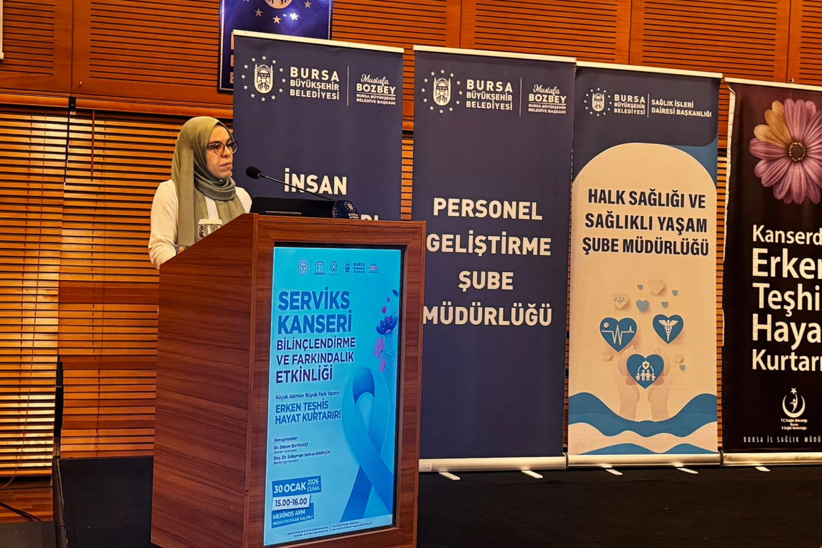 Ocak ayının Serviks Kanseri Farkındalık Ayı olarak kabul edilmesi kapsamında, Bursa Büyükşehir Belediyesi tarafından kadın çalışanlara yönelik ‘Serviks Kanseri Bilinçlendirme ve Farkındalık Etkinliği’ düzenlendi. İnsan Kaynakları ve Eğitim Dairesi Başkanlığı ile Sağlık İşleri Dairesi Başkanlığı iş birliğinde, İl Sağlık Müdürlüğü’nün desteğiyle gerçekleştirilen program, Atatürk Kültür Merkezi Merinos Yerleşkesi’nde yapıldı. Kadınlar arasında en sık görülen kanser türlerinden biri olan rahim ağzı kanserinin, düzenli tarama testleri sayesinde büyük oranda önlenebildiği ya da erken evrede teşhis edilebildiği vurgulanan etkinlikte, hastalıkla ilgili toplumsal farkındalığın artırılmasının önemi ele alındı. Programda Dr. Didem Bayrakçı, serviks kanseri taramaları, HPV testi ve smear testinin erken teşhisteki rolüne ilişkin bilgiler verdi. Doç. Dr. Süleyman Serkan Karaşin ise rahim ağzı kanserinin nedenleri, risk faktörleri, korunma yöntemleri ve güncel tedavi yaklaşımlarını katılımcılarla paylaştı. Sunumların ardından katılımcılar, merak ettikleri konular hakkında uzmanlara soru sorma imkânı buldu. Etkinliğe katılan Bursa Büyükşehir Belediyesi Genel Sekreter Yardımcısı Mehmet Emin Direkçi, rahim ağzı kanserinin önlenebilir bir hastalık olduğuna dikkat çekerek, “Kadınların sağlık konusunda bilinçlenmesi, güçlü ve sağlıklı bir toplumun temelini oluşturur. Erken teşhis hayat kurtarır ve bu bilincin toplumun her kesimine yayılması büyük önem taşımaktadır” dedi. Direkçi, Bursa Büyükşehir Belediyesi olarak önleyici sağlık hizmetlerini ve farkındalık çalışmalarını kararlılıkla sürdürdüklerini ifade etti.