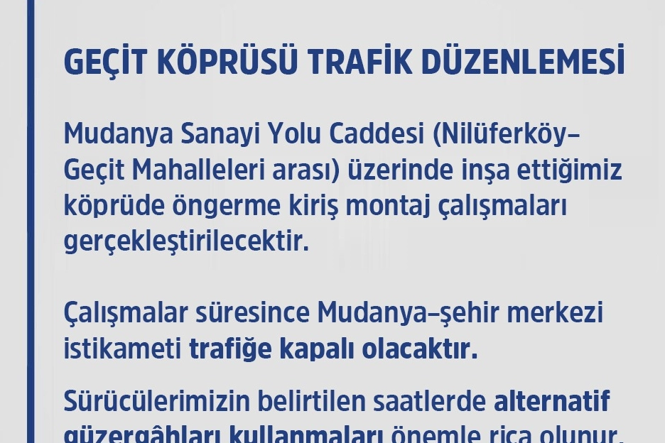 Montaj çalışmalarına 05 Ocak 2026 Pazartesi gecesi başlanacak olup, çalışmaların 5 gece sürmesi planlanmaktadır. Çalışmalar süresince, 00.00 – 06.00 saatleri arasında Mudanya–şehir merkezi istikametindeki yol trafiğe kapatılacaktır.
