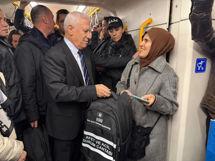 Bursa Büyükşehir Belediye Başkanı Mustafa Bozbey, daha sonra Beşeveler BursaRay İstasyonu’ndan metroya binerek vatandaşlarla birlikte Şehreküstü İstasyonu’na kadar yolculuk yaptı. Başkan Mustafa Bozbey tarafından vatandaşlara AKOM tarafından hazırlanan ve içinde ilk yardım kiti, battaniye, radyo, el feneri, diş fırçası, yağmurluk, düdük ve çöp torbası bulunan afet ve acil durum çantaları dağıtıldı. Yolculuk boyunca Bursalılarla afet konusunda sohbet eden Başkan Mustafa Bozbey, afetlere hazırlıklı olmanın önemine vurgu yaptı.