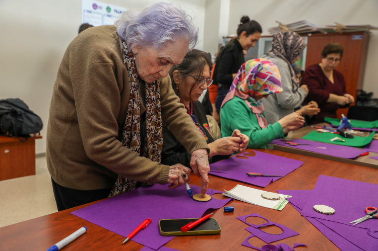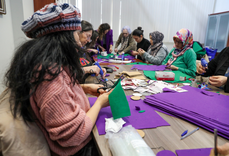 Bursa Kent Konseyi Kadın Meclisi’nin düzenlediği atölye çalışmasında, keçe kumaşlar, renkli iplikler, düğmeler ve süsleme malzemeleri kullanılarak birbirinden renkli ürünler hazırlandı. Kadınların dayanışma ve ortak üretim gücünü bir kez daha ortaya koyan ürünler, 8 Mart Pazar günü yapılacak yürüyüşte kullanılacak.