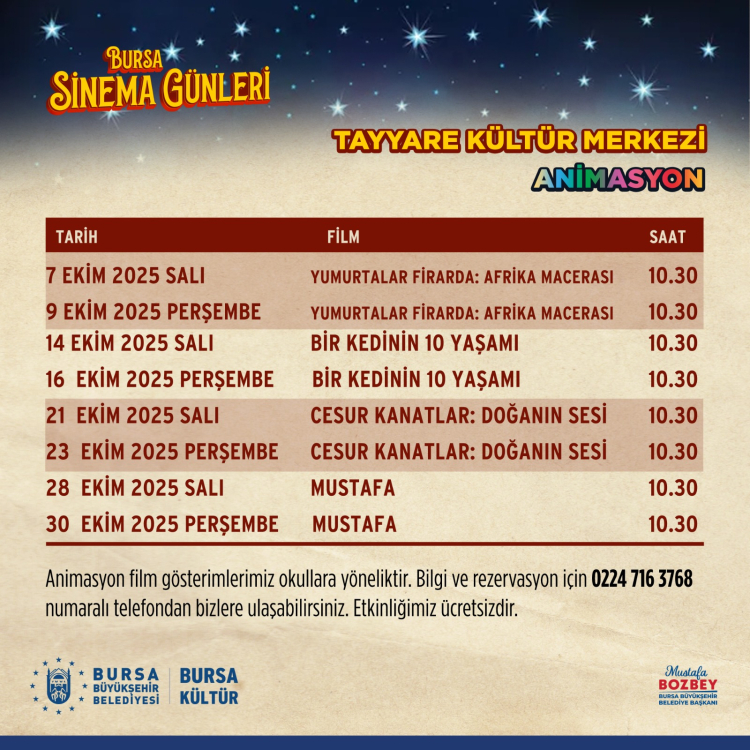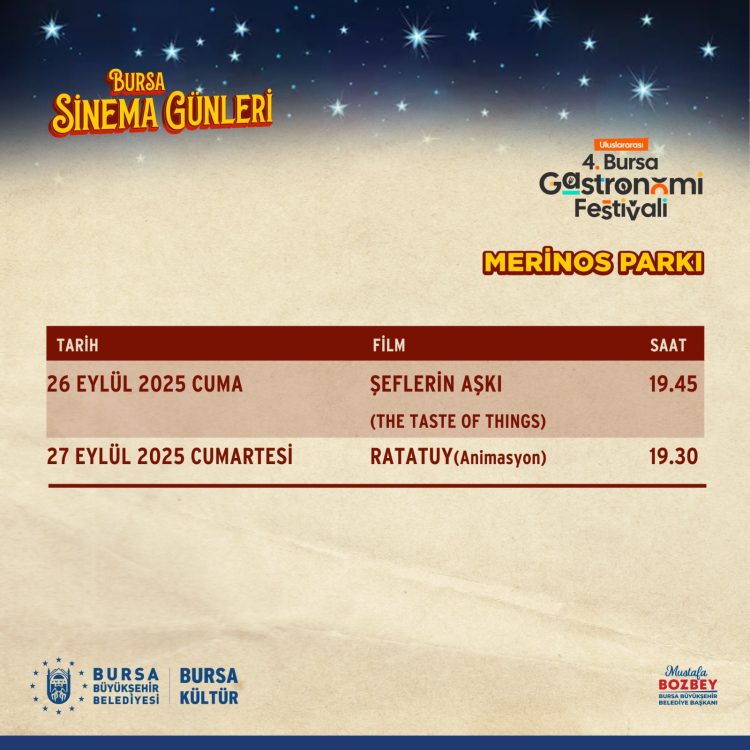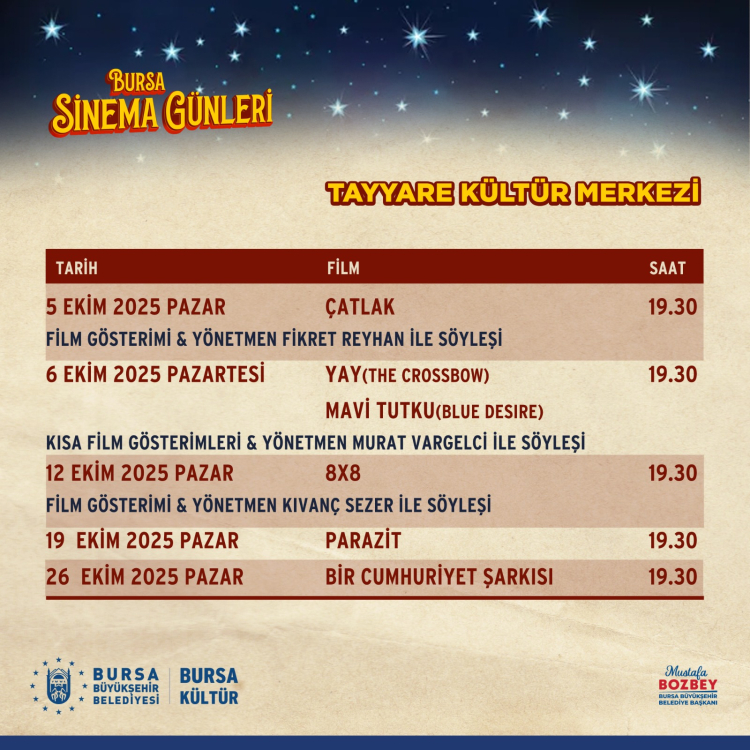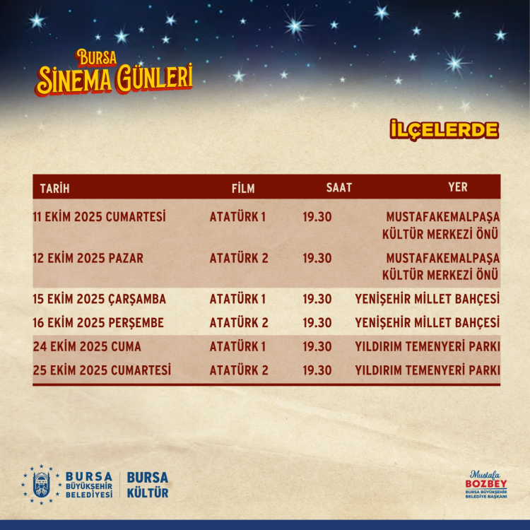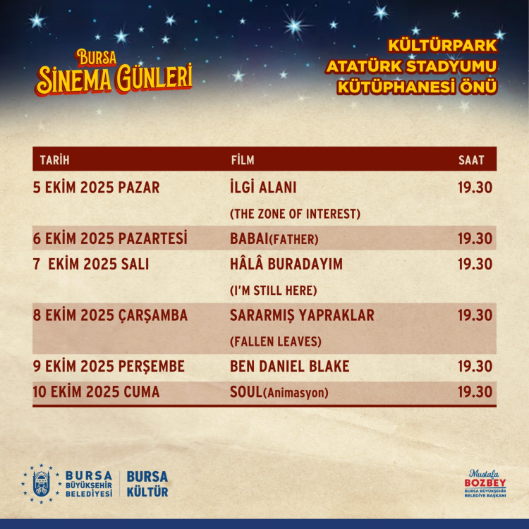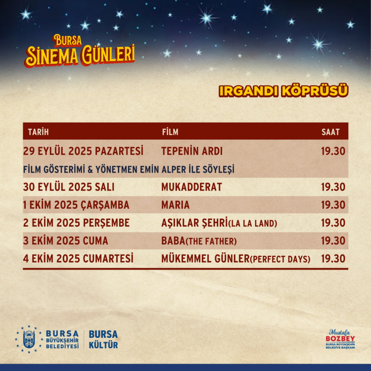 Irgandı Köprüsü, Atatürk Stadyumu Kütüphanesi önü, Merinos Parkı, Tayyare Kültür Merkezi ve ilçelerde gerçekleştirilecek gösterimler, Bursalılara yıldızların altında sinema keyfi yaşatacak. Bursa’nın tarihi ve kültürel mekânlarının büyülü atmosferinde yapılacak olan film gösterimleri, vatandaşlara hem yazdan kalma akşamların keyfini çıkarma hem de seçkin filmlerle buluşma fırsatı sunacak. Bursa Sinema Günleri kapsamında hazırlanan yönetmen söyleşileriyle de sinemanın mutfağına ışık tutulacak. Katılımcılar, yönetmenlerle bir araya gelerek film yapım süreci hakkında doğrudan bilgi alma ve soru sorma imkânı da bulacak.