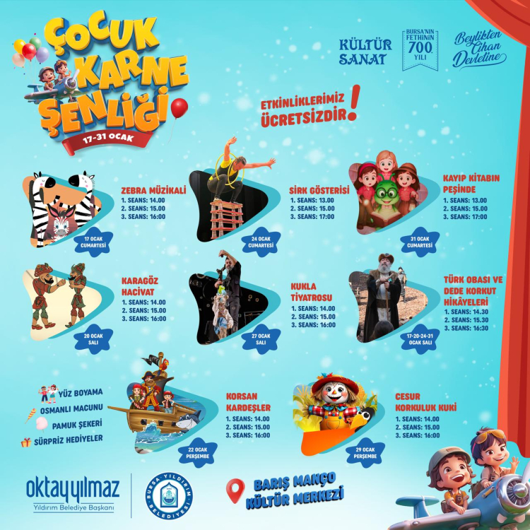 Yıldırım Belediyesi Kültür Sanat ve Sosyal İşler Müdürülüğü, çocukların dolu dolu bir tatil geçirmeleri için 17-31 Ocak tarihleri arasında Karne Şenliği düzenliyor. Barış Manço Kültür Merkezi’nde düzenlenen şenliklerde birbirinden eğlenceli etkinlikler ücretsiz şekilde çocuklarla buluşacak. Karne Şenlikleri kapsamında; 17 Ocak’ta Zebra Müzikali, 20 Ocak’ta Hacivat ve Karagöz oyunu, 22 Ocak’ta Korsan Kardeşler oyunu, 24 Ocak’ta sirk gösterisi, 27 Ocak’ta kukla tiyatrosu, 29 0cak’ta Cesur Korkuluk Kuki oyunu, 31 Ocak’ta Kayıp Kitabın peşinde oyunu ve 17-20-24-31 Ocak’ta ise Türk Obası ve Dede Korkut Hikayeleri çocuklarla buluşacak.